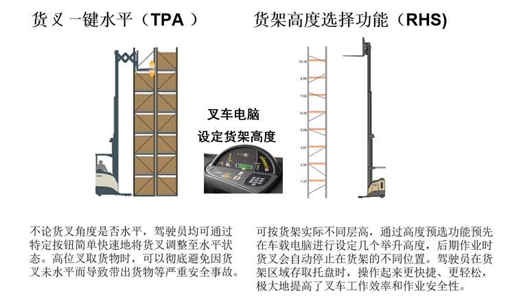 本款叉车独创性技术一键升高到位取货,