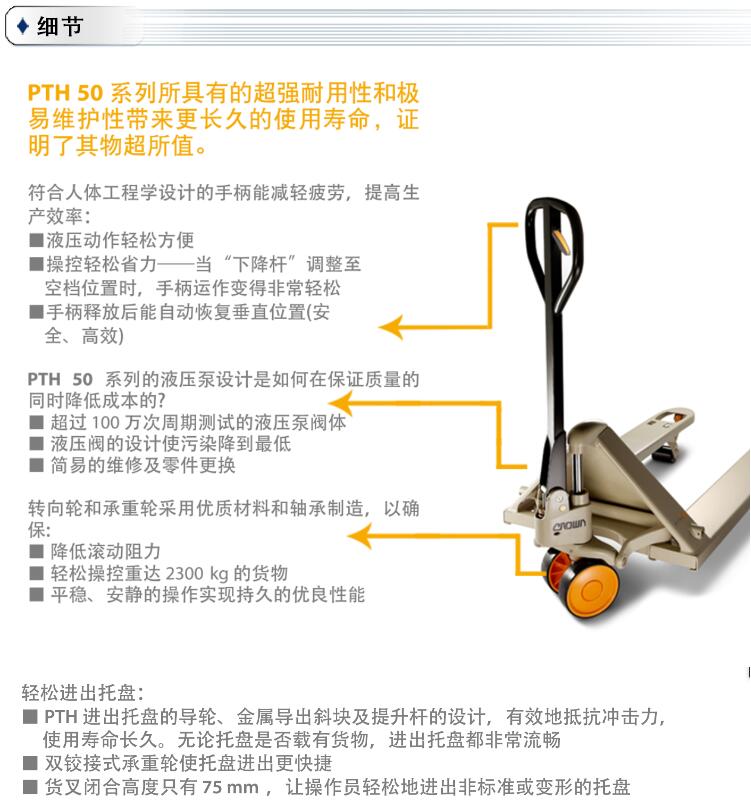 本款车型是Crown-科朗产品系列里的最小型叉车,但它延续了Crown-科朗叉车特有的高性能和高价值。本款车型从选材、工艺、设计,到制造和产品性能测试,所有环节我们均予以高度重视。Crown-科朗本款手动托盘车具有结构牢固、钢材用量大等优点,尤其在关键的承压部位,更体现其牢固的特性。其操作简易性及易于维护保养的卓越特点定能赢得您的赞赏。