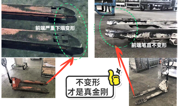 本款手动叉车充分具备经久耐用、货叉前段不变形、操作轻松三大特点