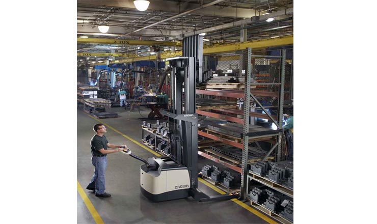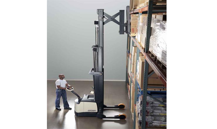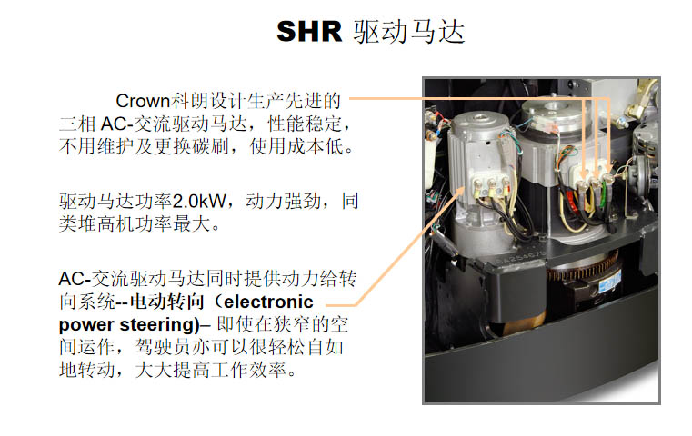 超小转弯半径——  Crown-科朗SHR系列步行前移式叉车,通过新型控制器和紧凑设计提升操纵性,具有前移式叉车中较小的转弯半径(1510mm)和较小的直角堆垛通道宽度(1.1m*1.1m托盘,直角堆垛通道宽度不足2.3米),超常狭小空间内也能方便使用。