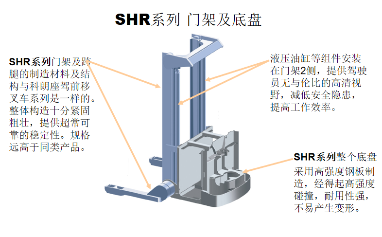 操作轻松简单 ——单手即可操作重达4000磅(1590kg)的货物。制动超越功能方便在极其狭小空间内进行作业,手柄几乎处于垂直位置。低位动力装置、清晰的门架设计(带嵌套式导轨)和高效的液压软管布置提供了良好的视野,便于快速安心地搬运高位货物。
