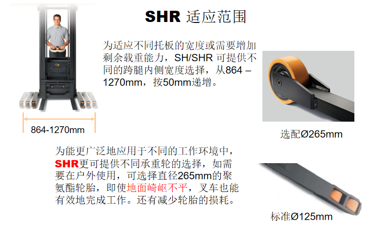 适用各种类型托盘——SHR步行前移式堆高车系列所采用的剪刀叉式前移装置融合了跨腿式堆高机的灵活操控性和平衡重叉车的广泛应用性,能够搬运各种类型的托盘。