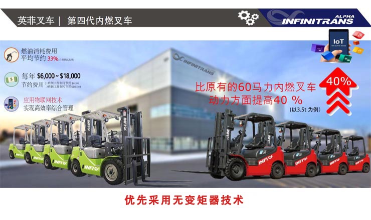 一、相比市场上同吨位内燃叉车,英菲叉车动力提升40%,燃油节省33%