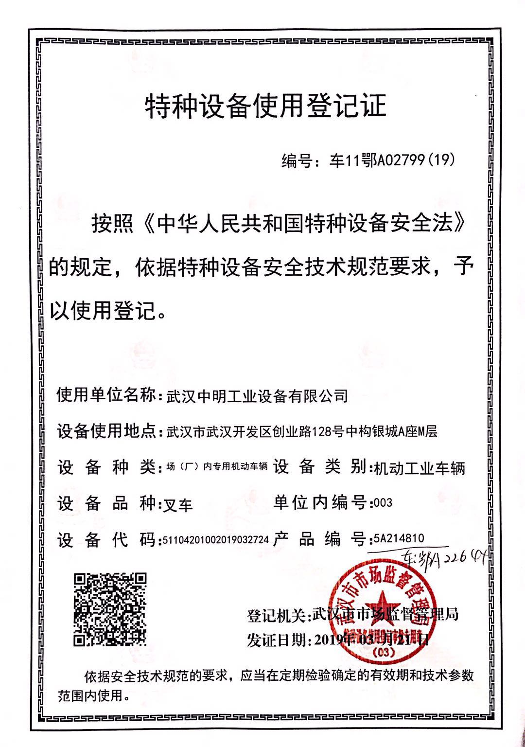 检验机构会在收到报检登记后15个工作日内,由检验员协调时间上门对叉车进行检验,上门检验合格后,需要在湖北省政务服务网申请使用登记证。