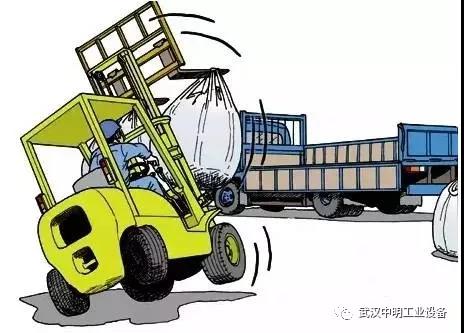 叉车司机用叉运两包吨袋装车,向后倒车时猛打了方向,叉车发生侧翻。