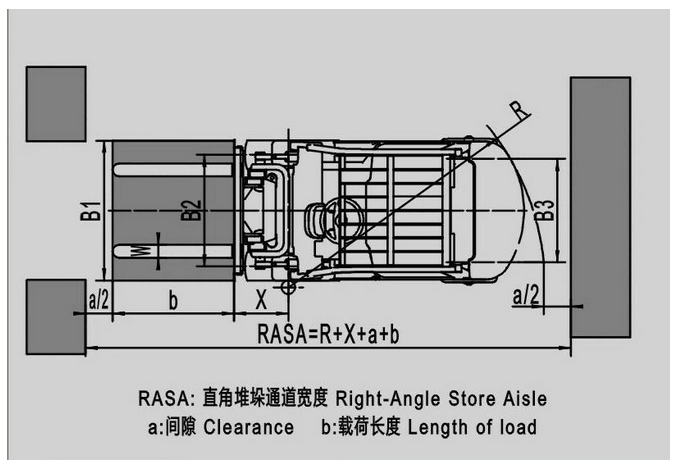 直角堆垛通道宽度是叉车进入工作场地后能否有足够空间作业的重要指标。通俗点讲就是叉车直行进入两个障碍物(比如两排货架)之间,然后旋转90度后进行叉取货物时,两个障碍物之间的距离。理论上直角堆垛通道宽度越小越好,可以节省货物的摆放空间,但实际上这个指标跟很多参数有关,计算值只做为参考。