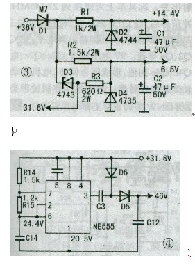 1.稳压电路 :该控制器的稳压电路如图3所示(图中 元件位号为自编号)。其电路较简单,采用电 阻降压、稳压二极管稳压,此方式已被越来 越多的无刷控制器所采用。 由于该控制器采用了无刷电机专用控 制芯片MC33035,加之驱动电路供电由 NE555升压后供给,所以对稳压电源的输出 功率要求较低,采用稳压二极管稳压即能满 足需求。 电池电压+36V一路经R1降压‘、.c1滤 波后得到约+14.4V电压,为MC33035DW 及过流、欠压检测IC(LM358)供电;另一路 经R.2、I)4、C2稳压至6.5V,为转把及霍尔 供电(此电压在控制器所附的接线说明图中 标注为5V,但实测为6.5V)。另外,此电源中 31.6V的取法较特殊,利用稳压二极管D3 的稳压特性,将R3和D4上的电压稳压 为+31.6V,作为NE555的供电电源。图中 D1为防反接二极管,防止因电池正负极连 接错误损坏电路。 值得一提的是,该电路中的稳压二极管 的型号标注分别为4744.、4743、4735,其实测 稳压值分别为14.4V、12.2V、6.5V。此类稳压 二极管标注不同于常规标法,难以通过型号 得知其稳压值。实修中,可换用相同或相近 稳压值的稳压二极管,但功率应不小于1W。