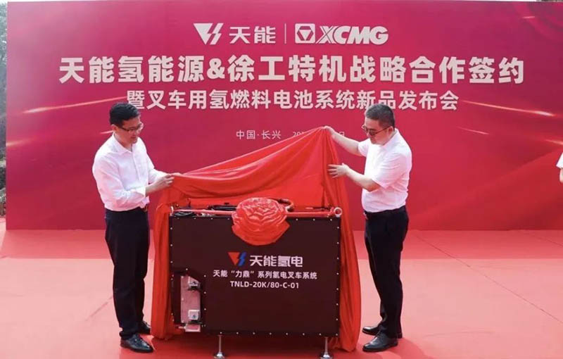 2021年9月28日,天能氢能源与徐工集团旗下公司徐州徐工特种工程机械有限公司(下称“徐工特机”)签订战略合作协议。签约仪式现场,天能氢能源正式发布了徐工叉车用氢燃料电池系统新品。