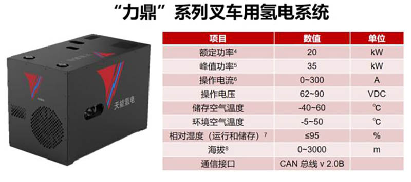 此次天能氢能源与徐工特机合作打造的适用于叉车专用的“力鼎”燃料电池系统,额定输出20kW,峰值输出可达35kW,燃料电池电堆设计寿命可达10000h,兼容市面上大部分铅酸或锂电电动叉车。产品在徐工叉车上进行配置应用后呈现“体积小,零碳排,加氢3分钟、工作5小时”的特点,有效解决了新能源叉车产品的续航问题。