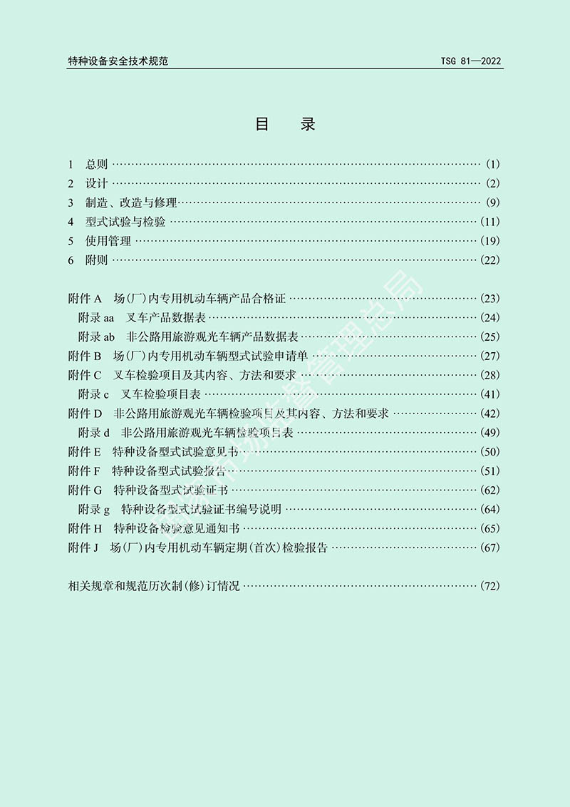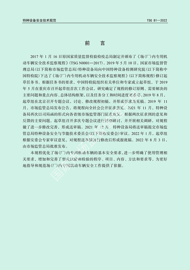 为贯彻落实《中华人民共和国特种设备安全法》《特种设备安全监察条例》,进一步优化场(厂)内专用机动车辆安全监管措施,市场监管总局对《场(厂)内专用机动车辆安全技术监察规程》(TSG N0001—2017)进行了修订,形成《场(厂)内专用机动车辆安全技术规程》(TSG 81—2022),现予公告,自2022年12月1日起施行。