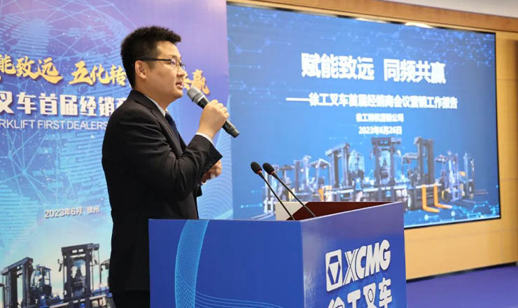 第二个环节是徐工叉车营销工作报告。徐工特机副总经理、营销公司总经理胡斯勒在会上作了营销工作主题报告,回顾近年徐工叉车取得的市场成就,从宏观角度深刻剖析全球及行业发展趋势,全面阐述了徐工叉车战略蓝图、经营模式、业务模式,开拓了我们经销商的经营思路和应对措施,鼓励叉车经销商们协同一致,行而不辍,未来可期。