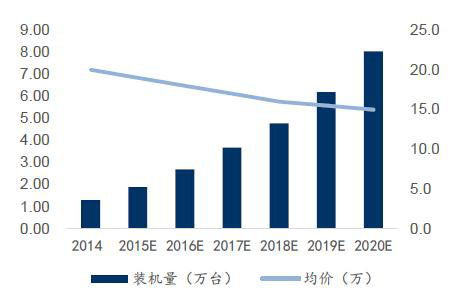 根据调研数据,2014年我国AGV的装机量为1.3万台,其中约1万台为国产品牌,3000台为外资品牌,从价值量来说,国内厂商占比大约60%,国外厂商占比40%。按照每年30%~50%的增长率估算,到2020年我国的AGV装机量将达到8万台。